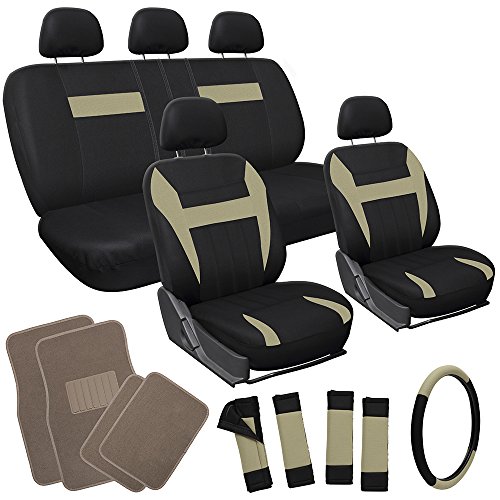 Why Use OxGord 21pc Black & Tan Flat Cloth Seat Cover and Carpet Floor Mat Set for the Mini Cooper Convertible, Airbag Compatible, Split Bench, Steering Wheel Cover Included ?