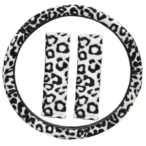 OxGord Leopard Steering Wheel Cover and Seat Belt Pad Set for the Nissan Maxima Sedan in Snow White Leopard Print